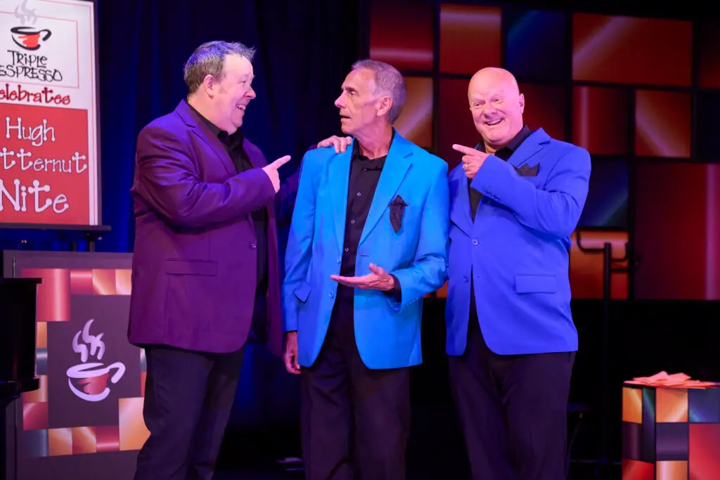 Triple Espresso tells the story of three guys whose bid for showbiz fame and fortune ended in 4-minutes of magnificent failure on national television. Hugh Butternut, Buzz Maxwell, and Bobby Bean tell their rags-to-rags story earnestly, with hysterical results. Butternut is a musician, a vulnerable soul with a lounge lizard smile; Maxwell is an uncertain magician with an attitude; and Bean is an irrepressible, all-over-the-map entertainer with big dreams. The laughter is infectious and the comedy appeals to everyone from first graders to college students to baby boomers.